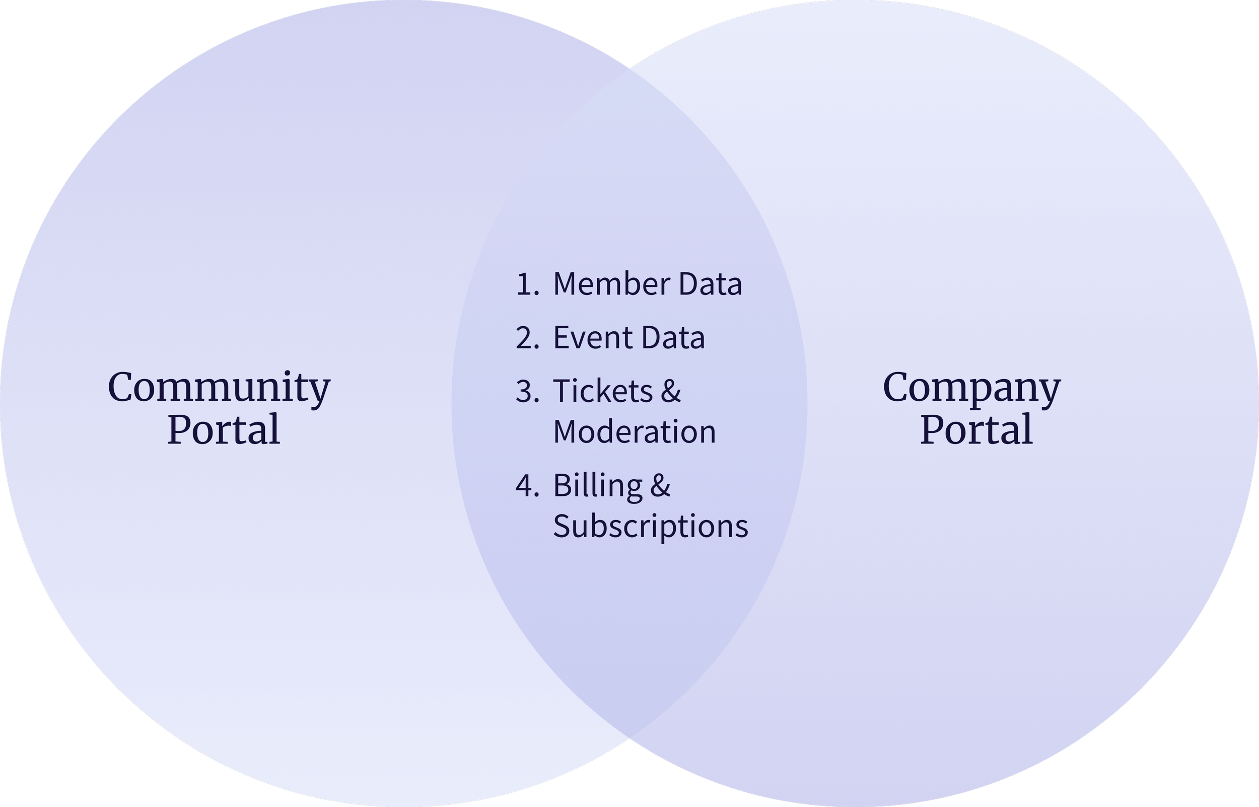 I mapped intersection areas between community and company portal to identify shared data and workflows, revealing four areas with different scopes and the backend touch-points engineering needed.