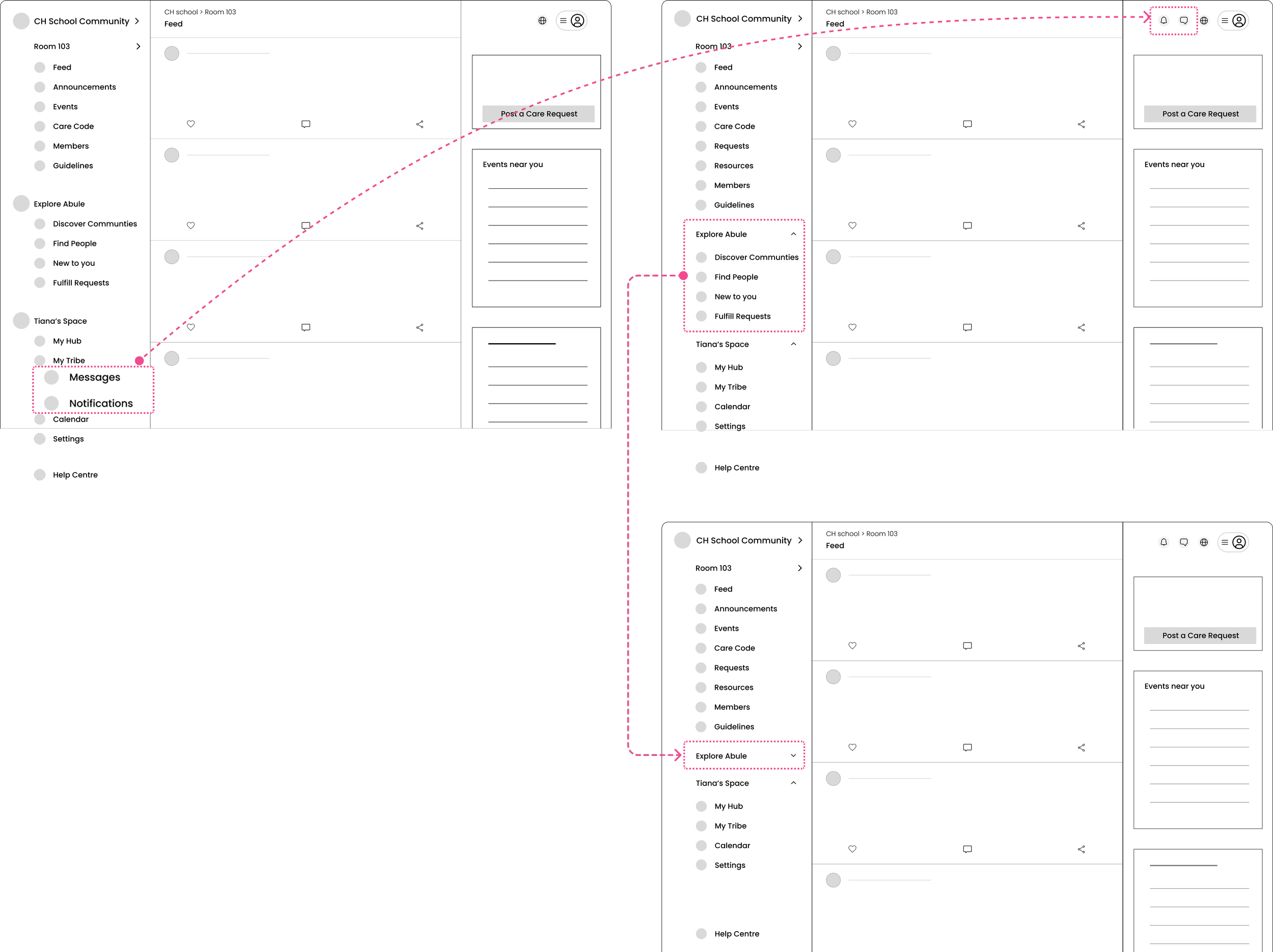 Issue 3: “Explore Abulé,” the entry point to discovering new communities and people, was hidden under the Feed tab, making it inaccessible from other feature pages. Users had to navigate back to Feed to find it, adding friction to a core flow built around community connection.