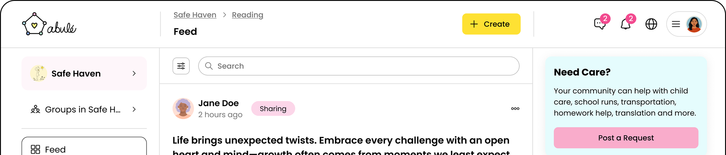 Currently a seed-stage company, Abulé is a care-tech startup disrupting the $648B care industry. It is a platform for parents to connect with support networks and communities.