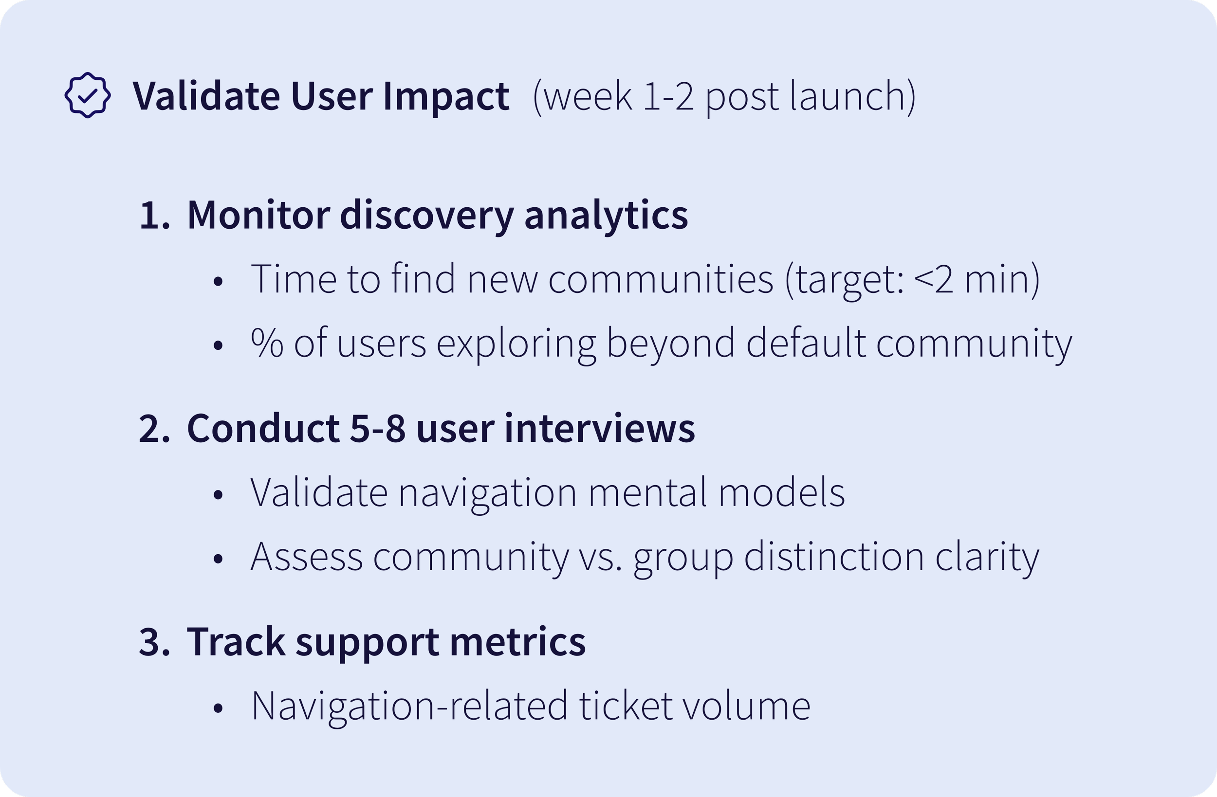 We’ll validate this by measuring time to find new communities and tracking percentage of users who explore beyond their default community.
