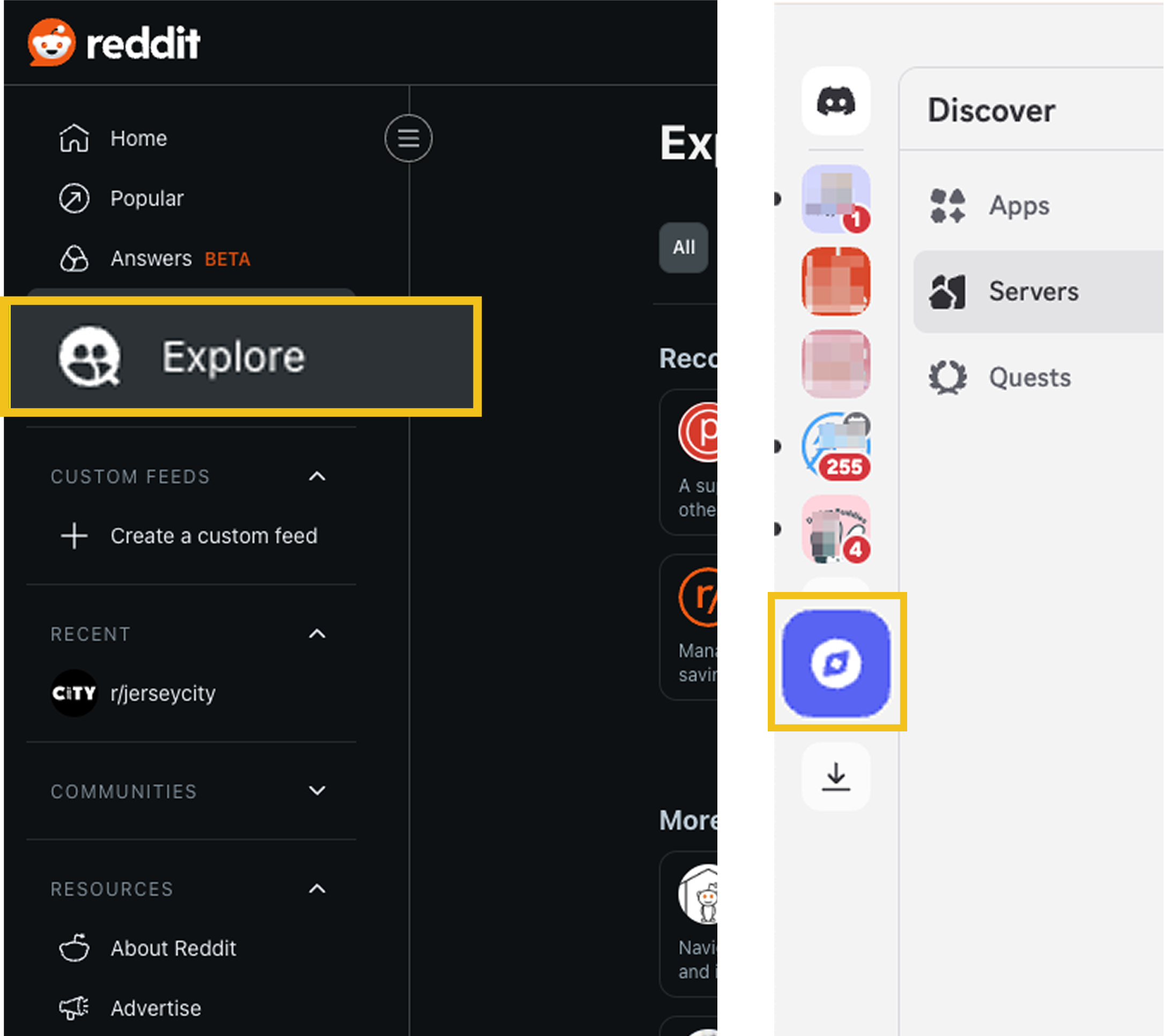 Discord and Reddit place Explore in global navigation for quick discovery of new communities.
