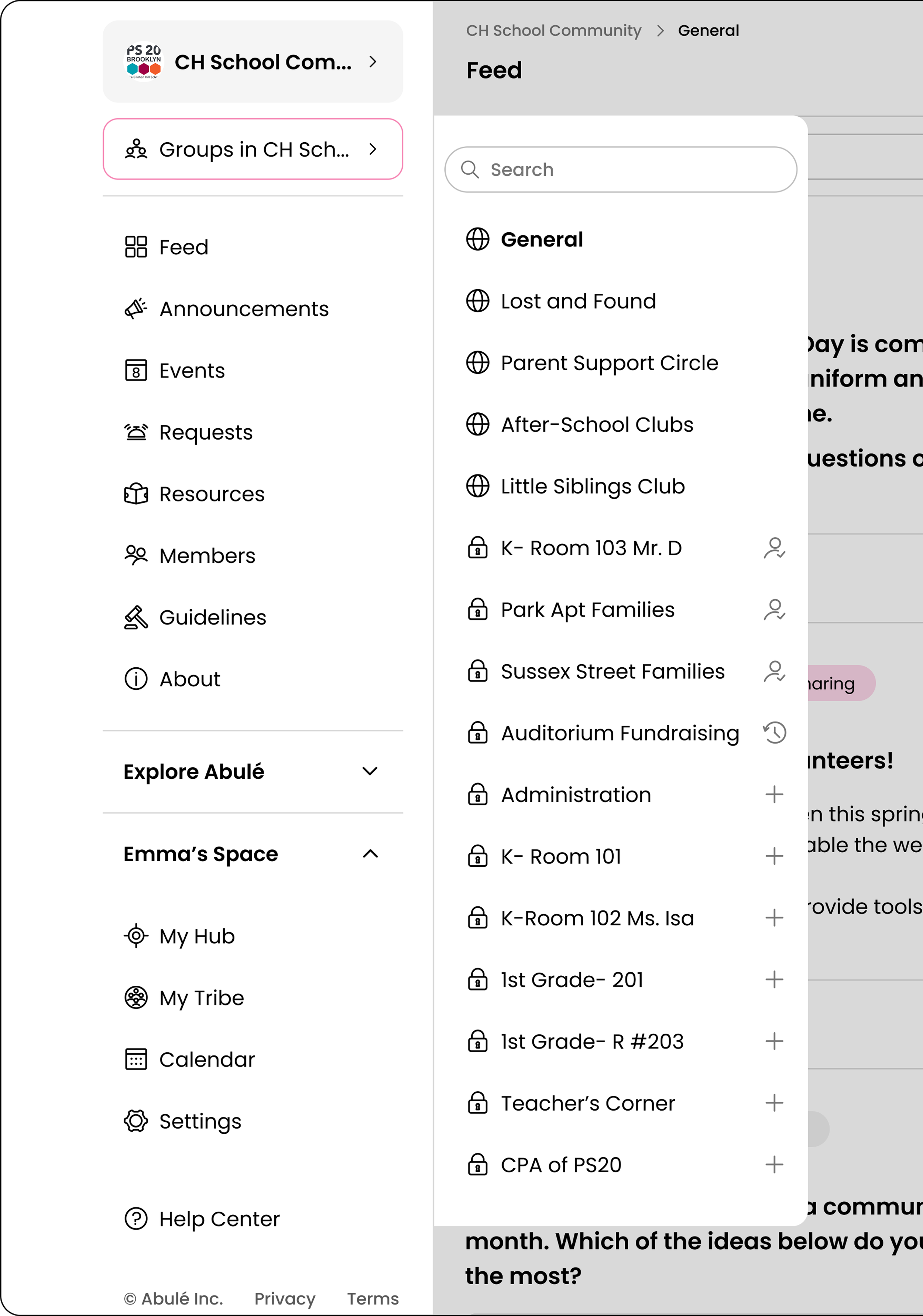 Abulé’s existing navigation didn’t support it’s nested structure. Group switching was hidden under the community name. Hidden ‘Explore Abulé’, under Feed, was blocking the core value prop- community discovery.