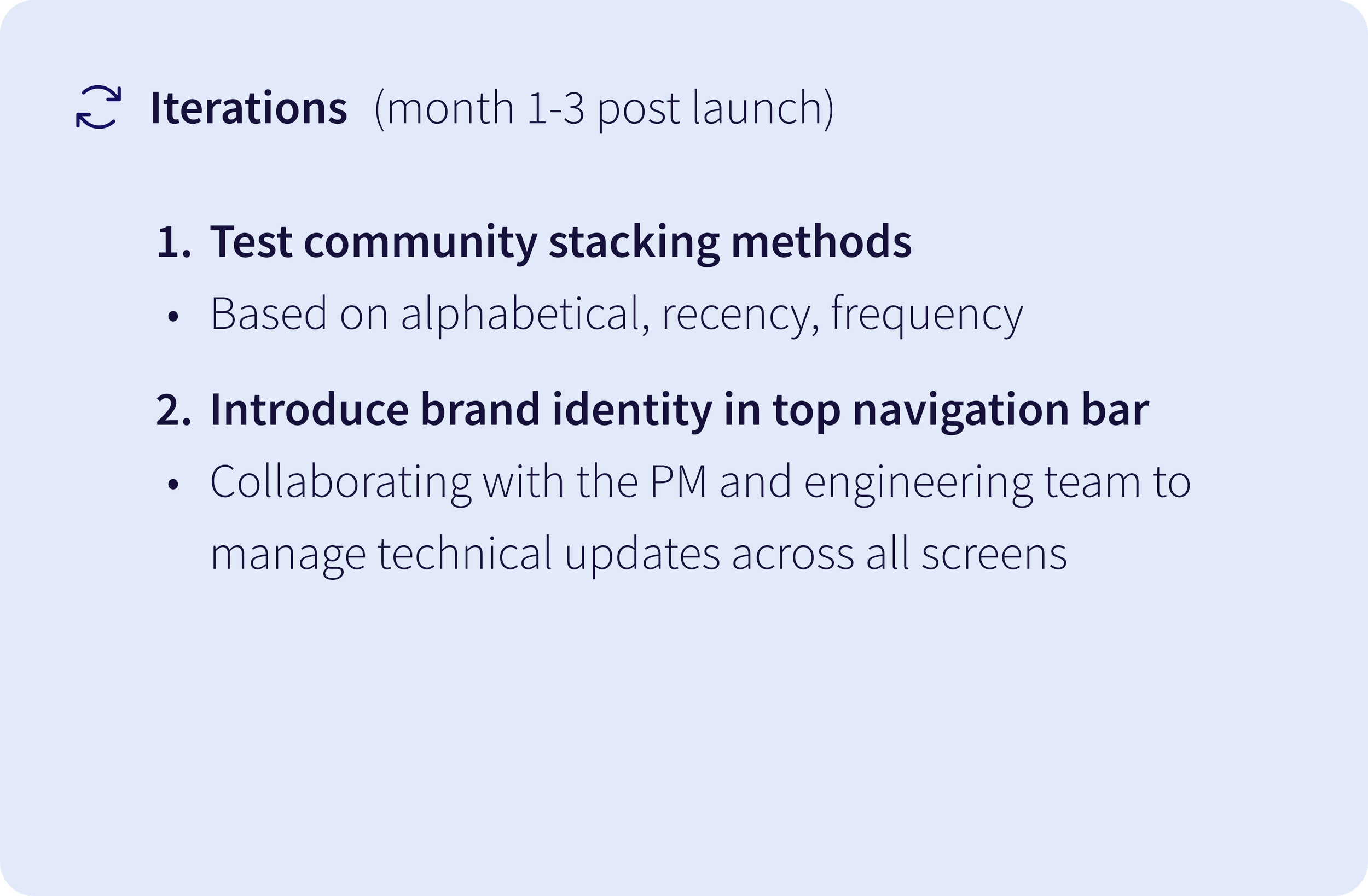 While I gathered feedback from teammates (who are close to our target users, parents), if I had more time, I would have run quick 3-in-30 usability tests on the community-switching overlay pattern to uncover any key issues earlier, leading to sharper iterations before full implementation.