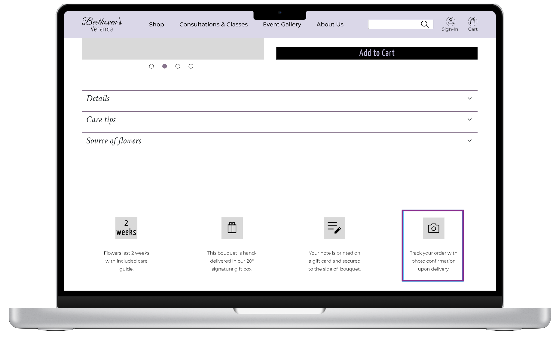 Empower users on product detail page with key information like bouquet size, vase selection, care tips, packaging, order tracking, and add-on options.