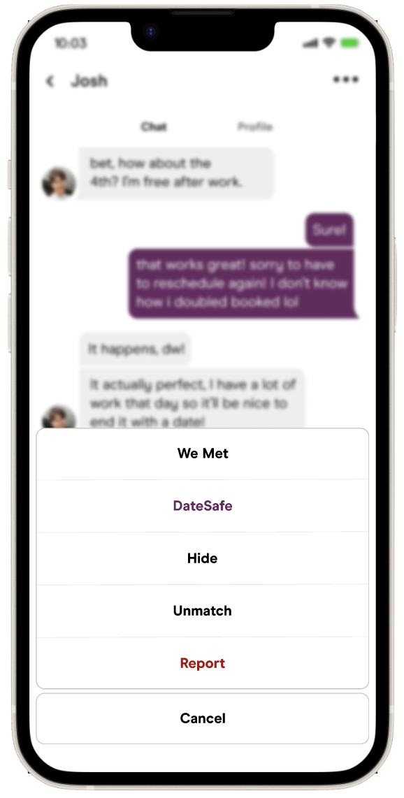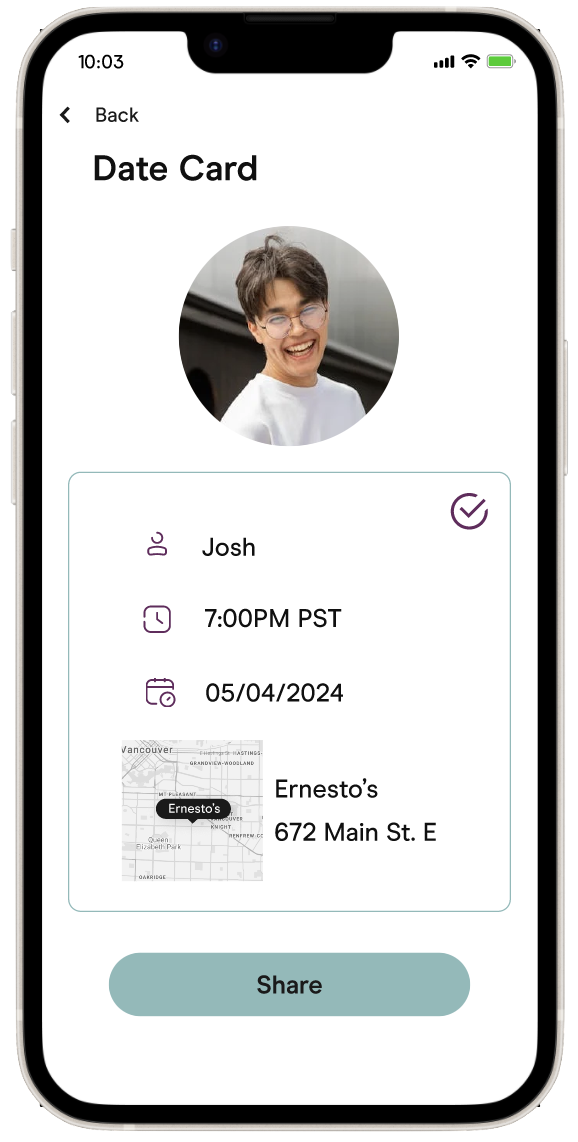 DateSafe empowers users to securely share upcoming date details with a trusted friend, adding a layer of safety for first-time in-person meetings.