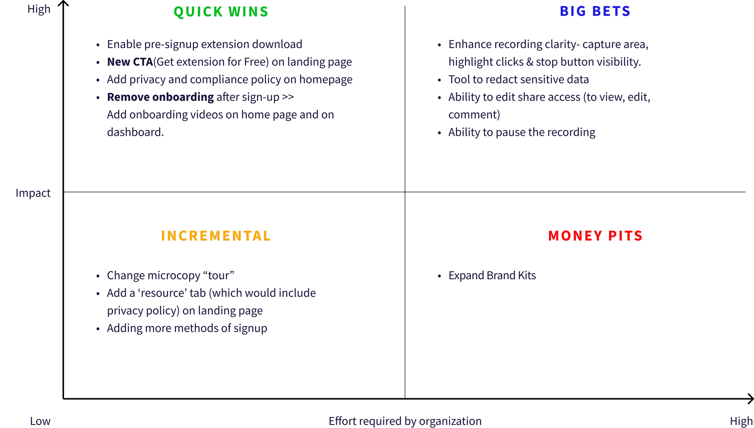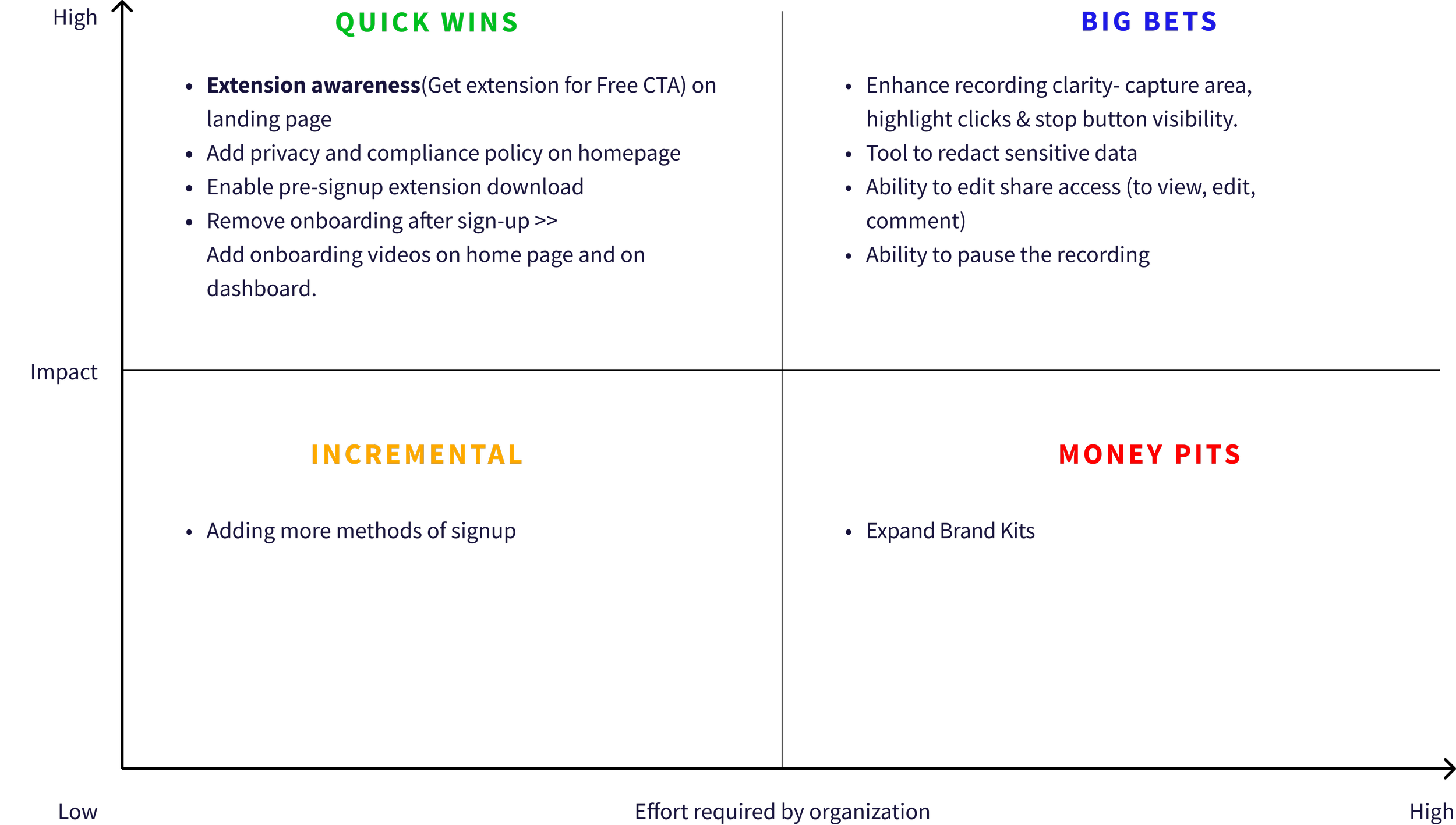 I facilitated a design thinking workshop for our UX team to translate research insights into design ideas. We defined a MVP using an impact-effort matrix to prioritize key improvements and define achievable goals for the remaining 2 weeks. User interviews revealed significant privacy concerns impacting sign-up, which the founder had initially de-prioritized. This feedback led us to reconsider and include privacy improvements in the MVP.